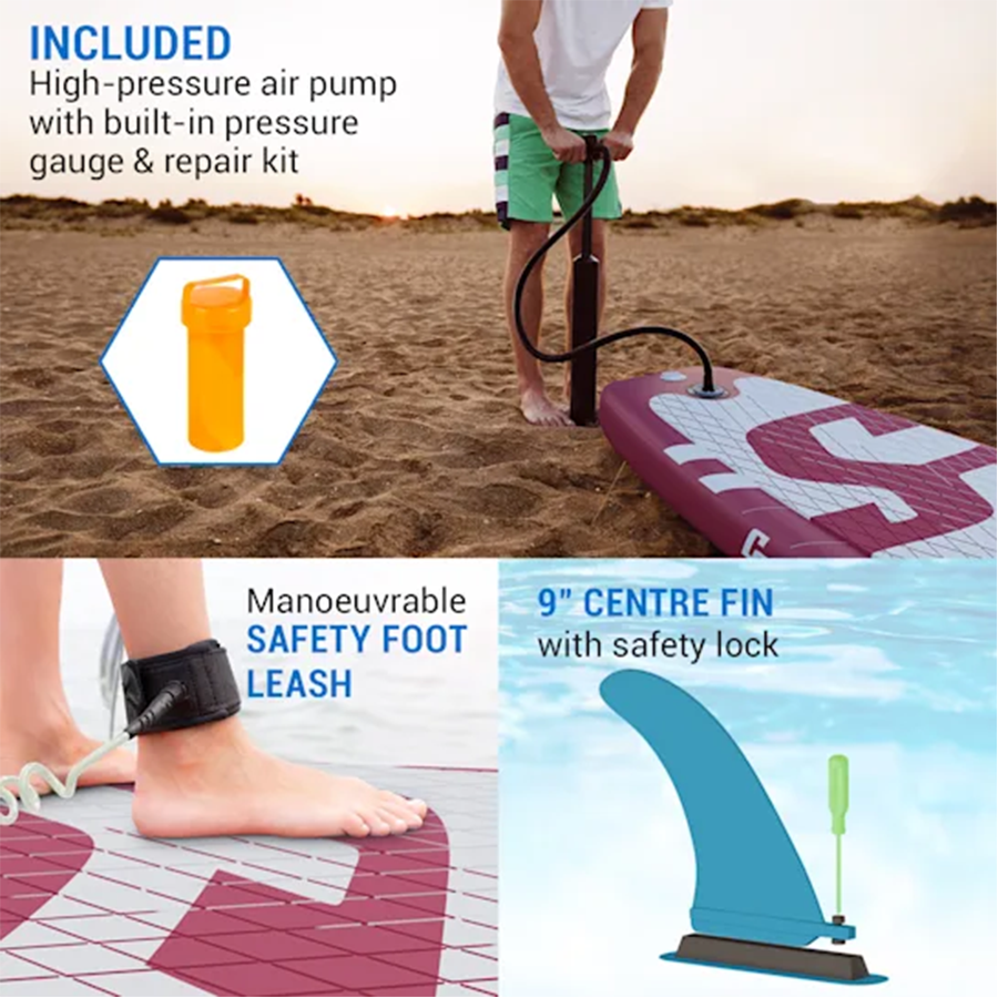 Inhoud: 1 paddleboard, 1 telescopische peddel, 3 afneembare vinnen, 1 veiligheidslijn, 1 rugzak, 1 reparatieset en 1 dubbelslag hogedrukpomp met manometer.